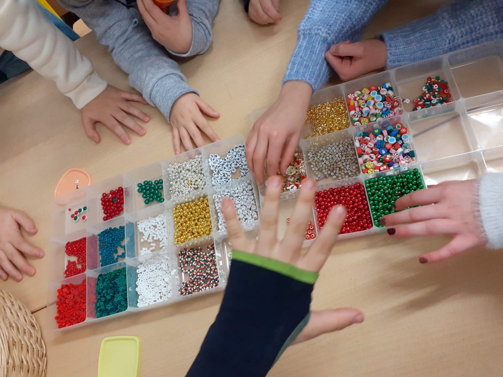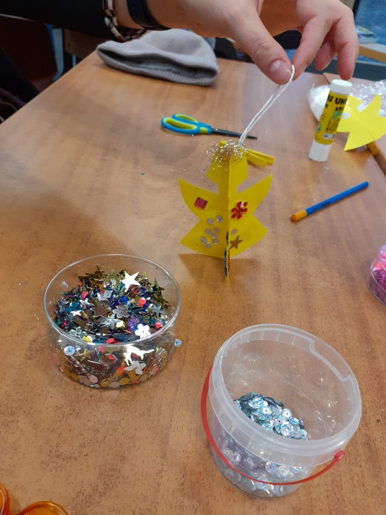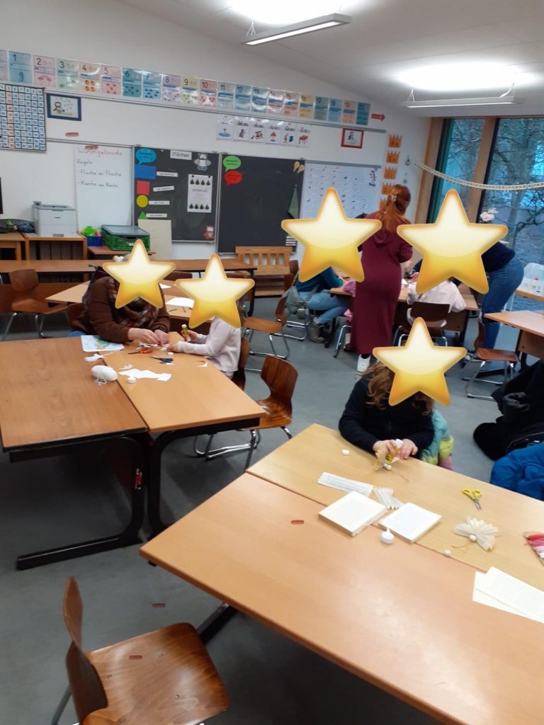 In den Räumen der Eingangsstufe erwartete die Kinder ein vielfältiges winterliches Angebot. Dort konnten sie in der Engelwerkstatt kreativ werden, Briefe an den Weihnachtsmann oder das Christkind schreiben, winterliche Armbänder gestalten oder kleine Kunstwerke aus Papiertüten (Lichtertüten sowie Papiersterne) basteln.