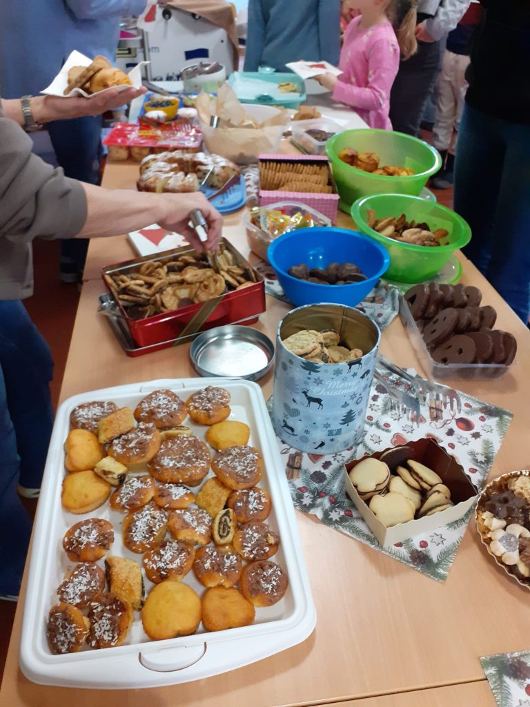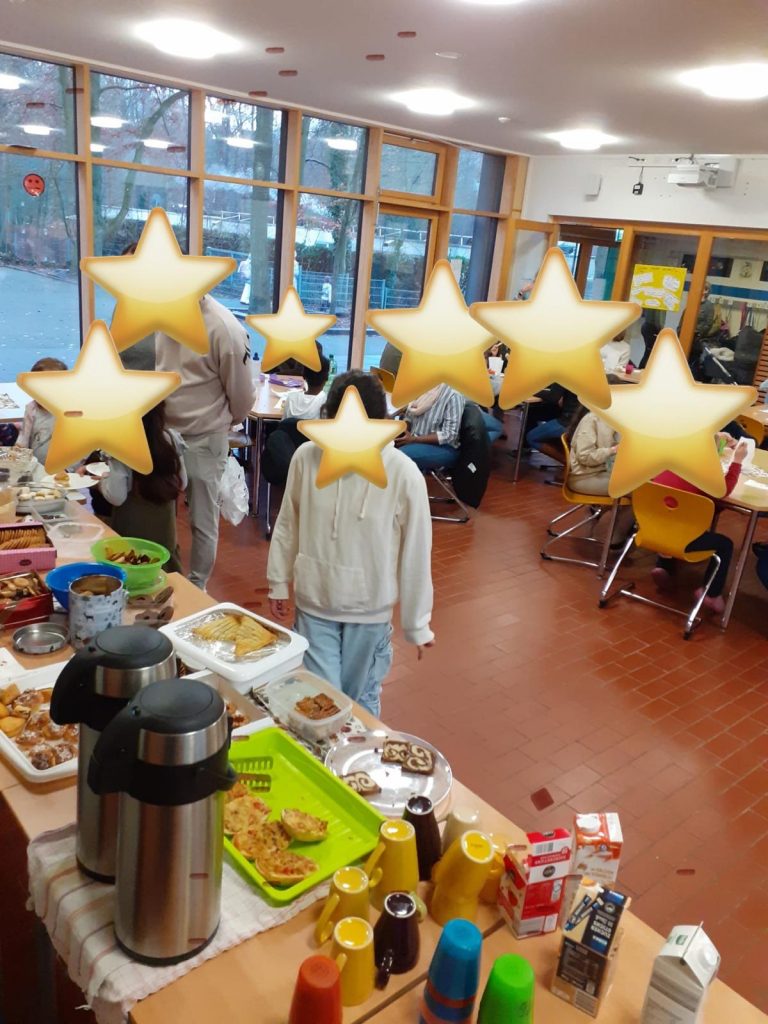 Auch für das leibliche Wohl war bestens gesorgt: In der Mensa wärmten Punsch und Kaffee die Gäste, während ein großes Buffet mit selbstgemachten winterlichen Köstlichkeiten von den Familien bestückt wurde.