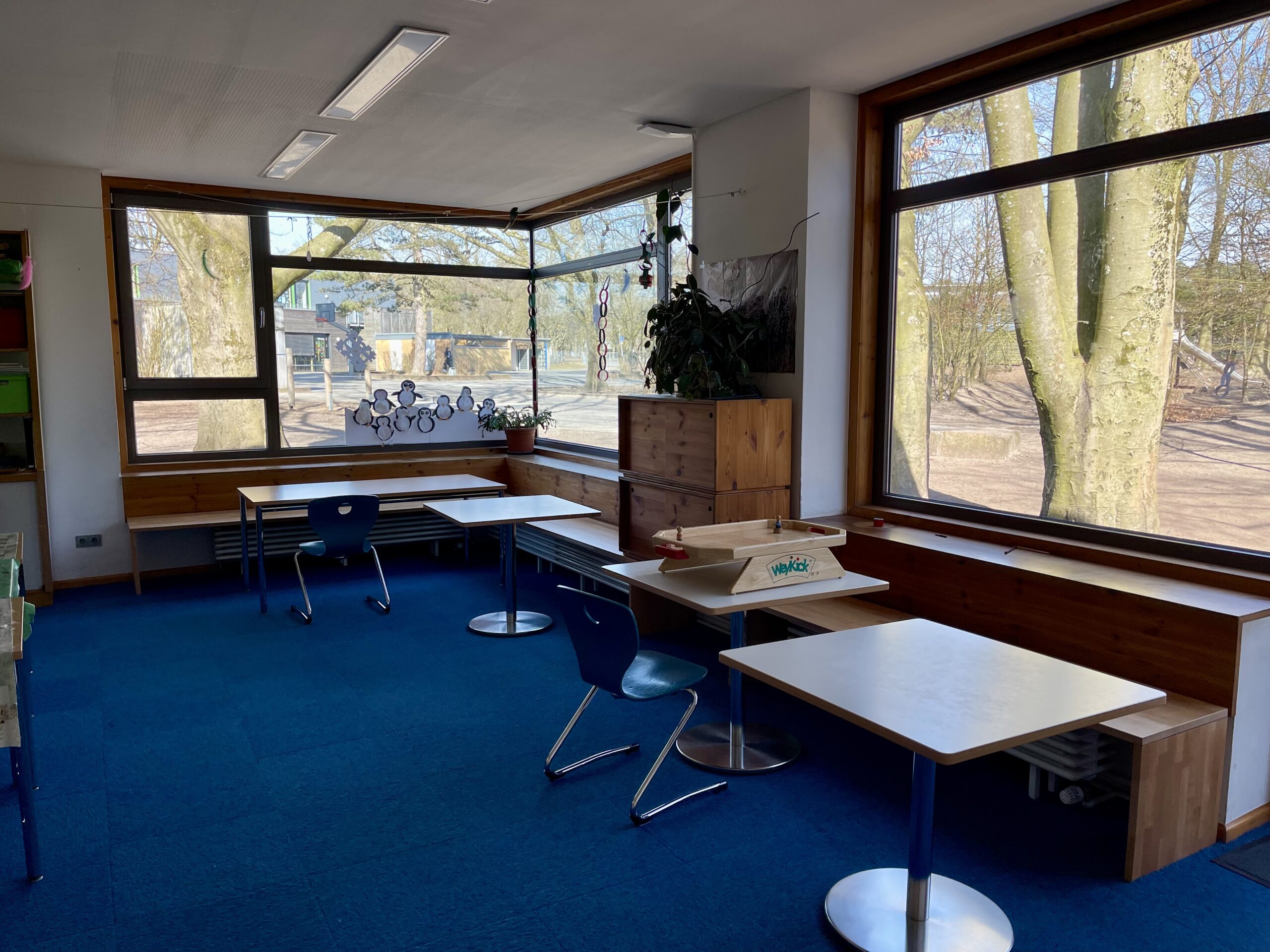 Unsere Betreuungsräume sind in einem Erweiterungsbau der Schule untergebracht. Dieser Bau schließt sich an den Schulbereich an, in dem sich die Klassen der Eingangsstufen befinden. So entsteht gerade für unsere „Kleinen“ ein hohes Maß an räumlicher Orientierung. Auch die Mensa befindet sich in unmittelbarer Nähe der OGS und den Klassenräumen.